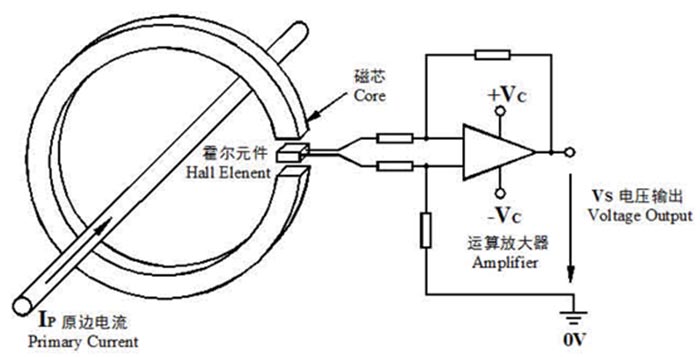 放大電路接受霍爾元件的輸出,并放大為電流信號提供給副邊補償繞組,副邊補償繞組在磁芯中產(chǎn)生的磁場與原邊電流產(chǎn)生的磁場在氣隙處大小相等,方向相反,抵消原邊磁場,形成負反饋閉環(huán)控制電路。